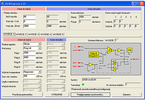 Each output can be individually configured and also each state of any output may be made logically dependent on the state of one-out-of two binary input. Binary inputs can modify threshold values, thus allow for simple testing of overspeed protections (without forcing a machine to run with such speed), or they may actuate specific outputs to programmable algorithm (e.g. protection signals from external circuits can be OR-ed). All parameters are set and algorithms are selected by programmable modification of specific system registers in the ES-03 unit. The computer program named es03_ver2.exe is used for this purpose.