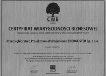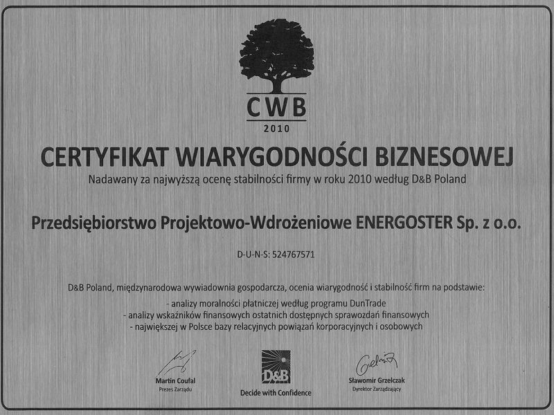 • 2010r. - firma uzyskuje Certyfikat Wiarygodności Biznesowej nadawany za najwyższą ocenę stabilności firmy według firmy D&B Poland