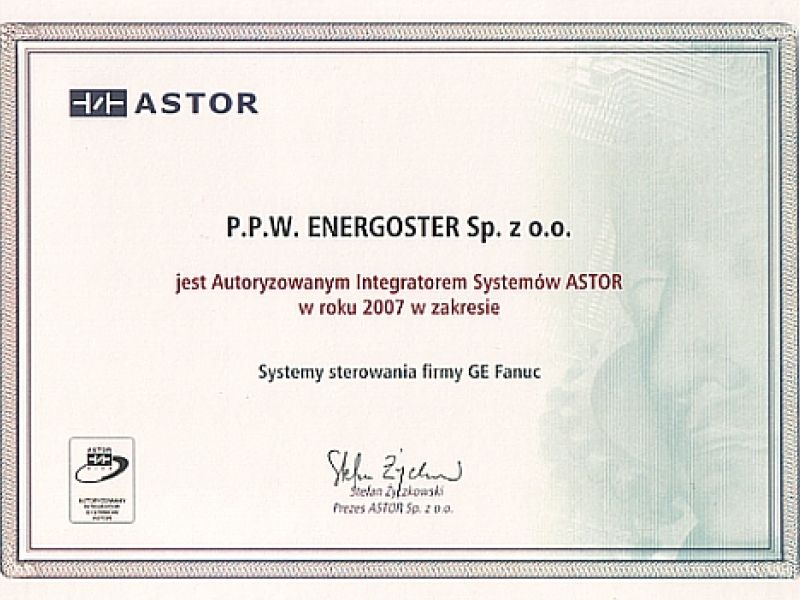 • 2008r. - PPW Energoster Sp. z o.o. ponownie zostaje Autoryzowanym Integratorem Systemów ASTOR; w wyniku recertyfikacji, firma uzyskuje certyfikat ISO 9001:2008 o numerze PL PL8000296/P