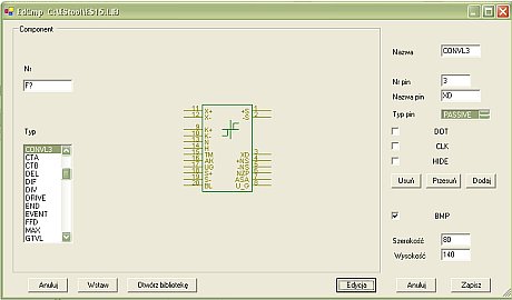 Schematy budowane są w oparciu o bibliotekę elementów. W programie istnieje też możliwość edycji elementów biblioteki.